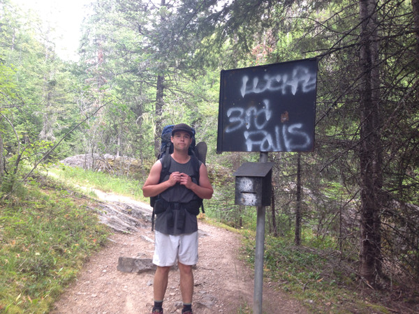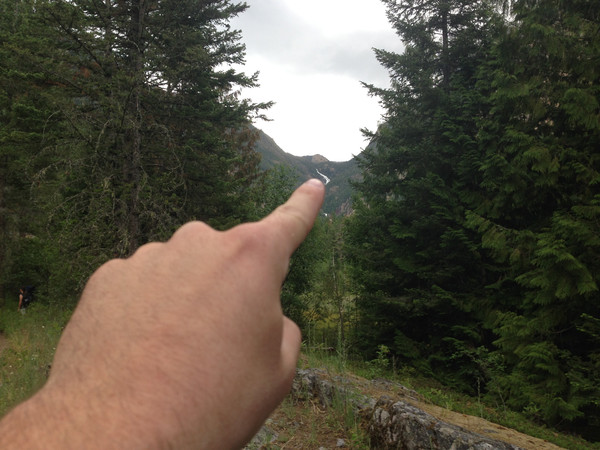 This is a photo of where we are heading. At the tip of my finger is Elizabeth Falls and above that is Lucifer Lake.
